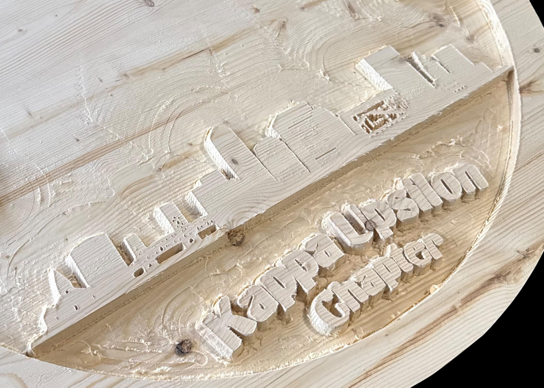 The completed chapter logo stands as a powerful wooden display representing pride, tradition, and brotherhood.
